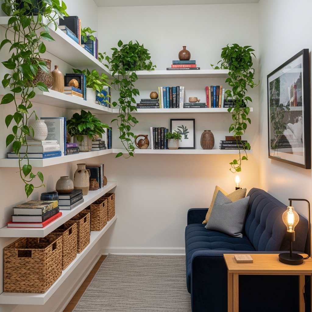 In a small room, your walls are your biggest asset. Don’t stop shelving at eye level — take it all the way to the ceiling. Floor-to-ceiling built-in or floating shelves draw the eye upward, make the ceiling feel higher, and give you enormous storage without taking up any floor space. Style the top shelves with plants and pretty objects for a finished, editorial look.