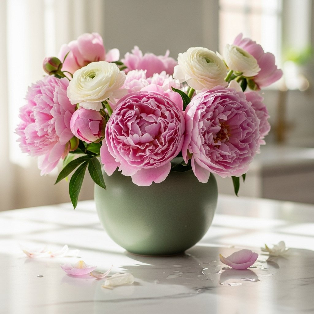 When choosing spring flowers for your kitchen, think about the overall palette you are working with. If your kitchen has white or neutral tones, go for bold pinks, coral, or sunny yellow — the contrast is stunning. If your kitchen leans warm and earthy, choose softer blooms in cream, blush, or peachy apricot. For a kitchen with dark cabinetry, pure white flowers with lots of greenery create a striking, editorial look that photographs incredibly well.