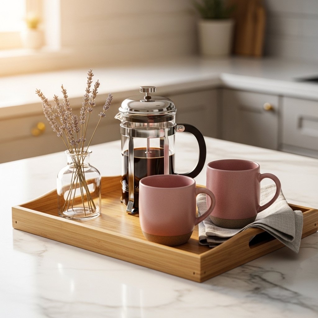 Start with a wooden or marble tray to anchor and contain the space — this immediately gives the station a polished, intentional look. Arrange your coffee essentials on the tray: your coffee maker or French press, a small milk jug or creamer, and your favorite mug. Choose spring-colored mugs for the season — dusty rose, sage green, soft blue, or speckled cream. Add a small vase of dried flowers or a single fresh stem. Fold a linen cloth nearby.