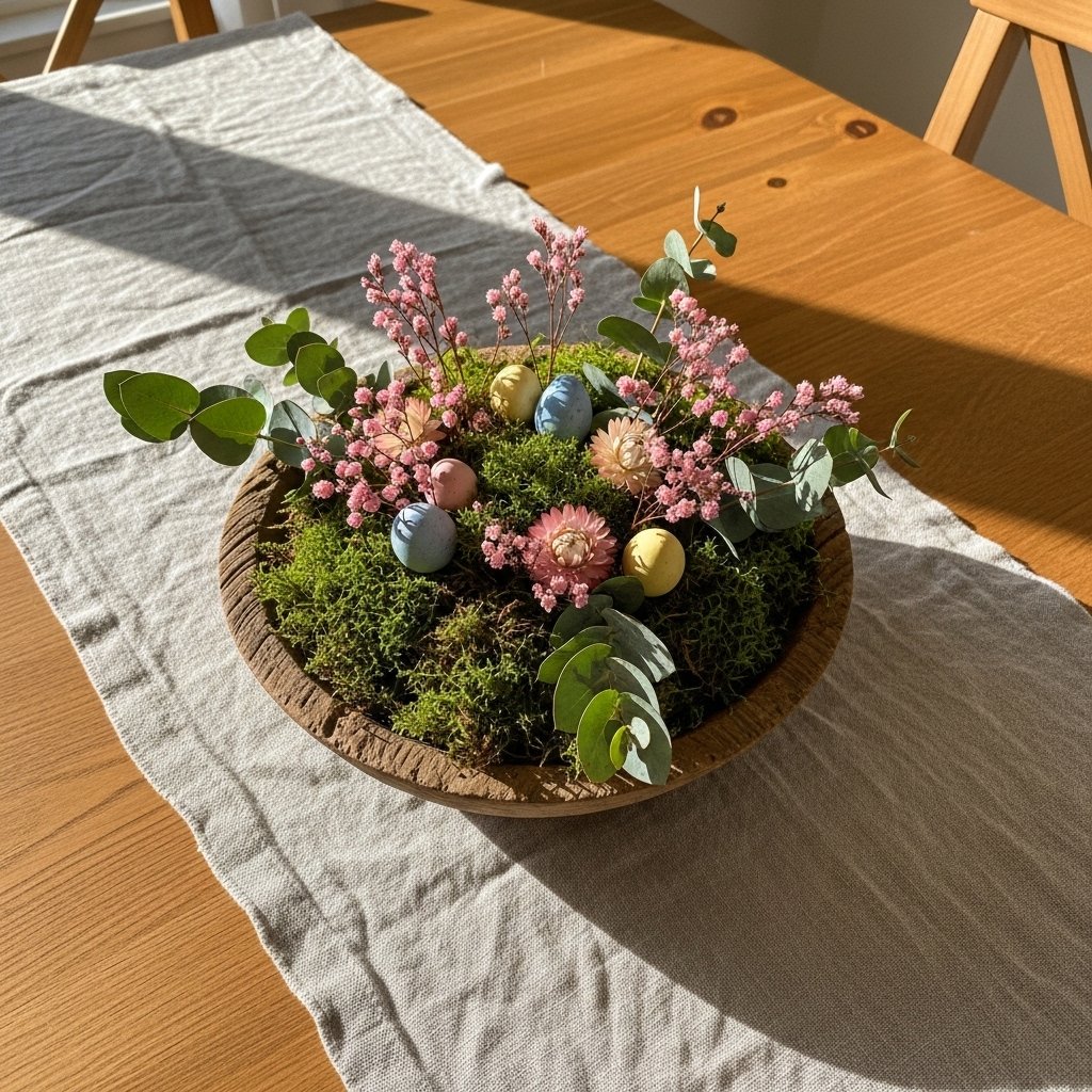 One of the most beautiful and affordable spring table centerpieces is a low wooden bowl or ceramic dish filled with a combination of mossy green floral foam or dried moss, a few fresh or dried flowers (wildflowers work beautifully here), some spring greenery, and a few small decorative eggs in soft, matte colors for early spring. Keep the arrangement low so it does not obstruct sightlines or conversation across the table — the rule of thumb is that a table centerpiece should never be taller than about eight inches.