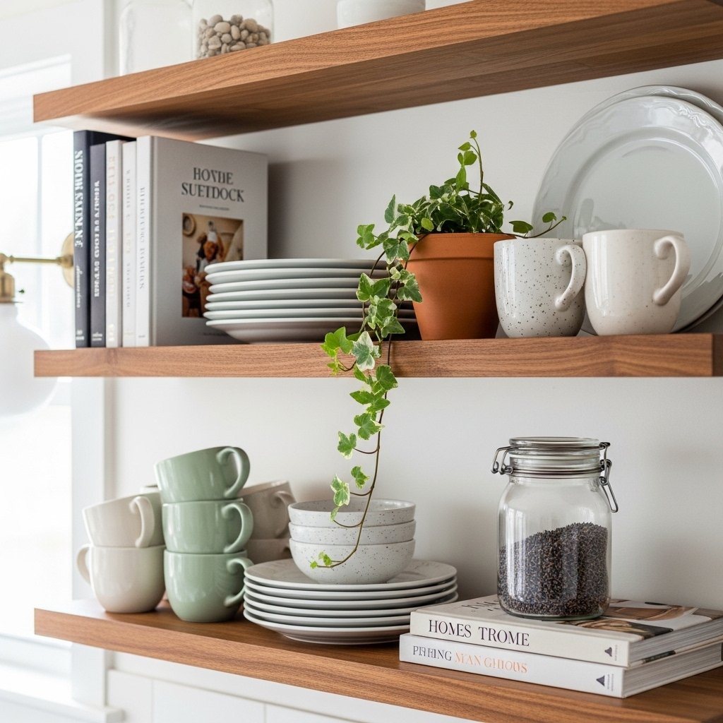 Open kitchen shelves are one of the most powerful styling opportunities in any kitchen, and spring is the perfect time to take full advantage of them. The key principle for beautiful open shelf styling is this: create visual rhythm by varying height, varying texture, and limiting your color palette to two or three complementary tones. For spring, build your shelf palette around soft whites, sage greens, warm creams, and natural wood and terracotta accents.
