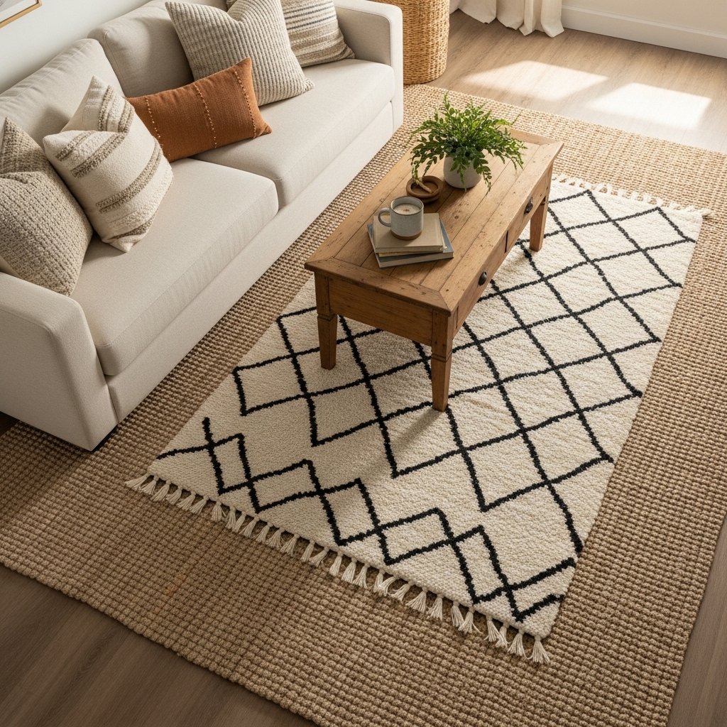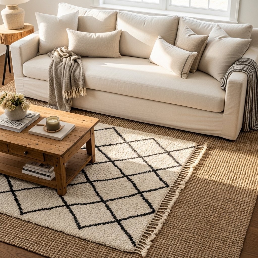 Layering rugs is one of the most beloved farmhouse styling tricks on Pinterest. Try placing a large jute rug as your base layer, then layer a smaller patterned rug — a Moroccan-style beni ourain or a striped cotton flat-weave — on top for contrast and softness.