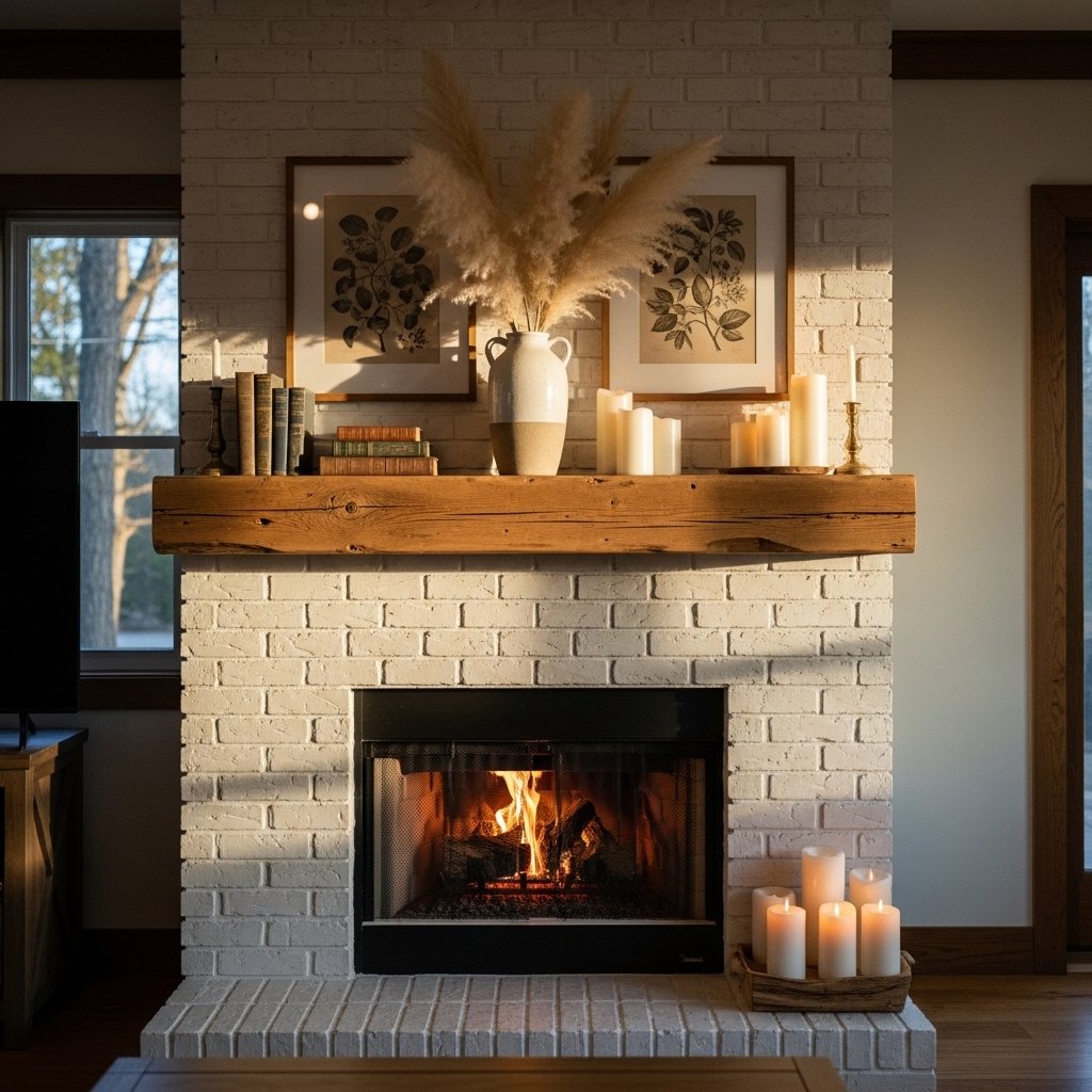 If you are lucky enough to have a fireplace, make it the undisputed star of your living room. A white-painted brick surround, a reclaimed wood mantle, and a thoughtfully styled mantelpiece create the ultimate modern farmhouse focal point.