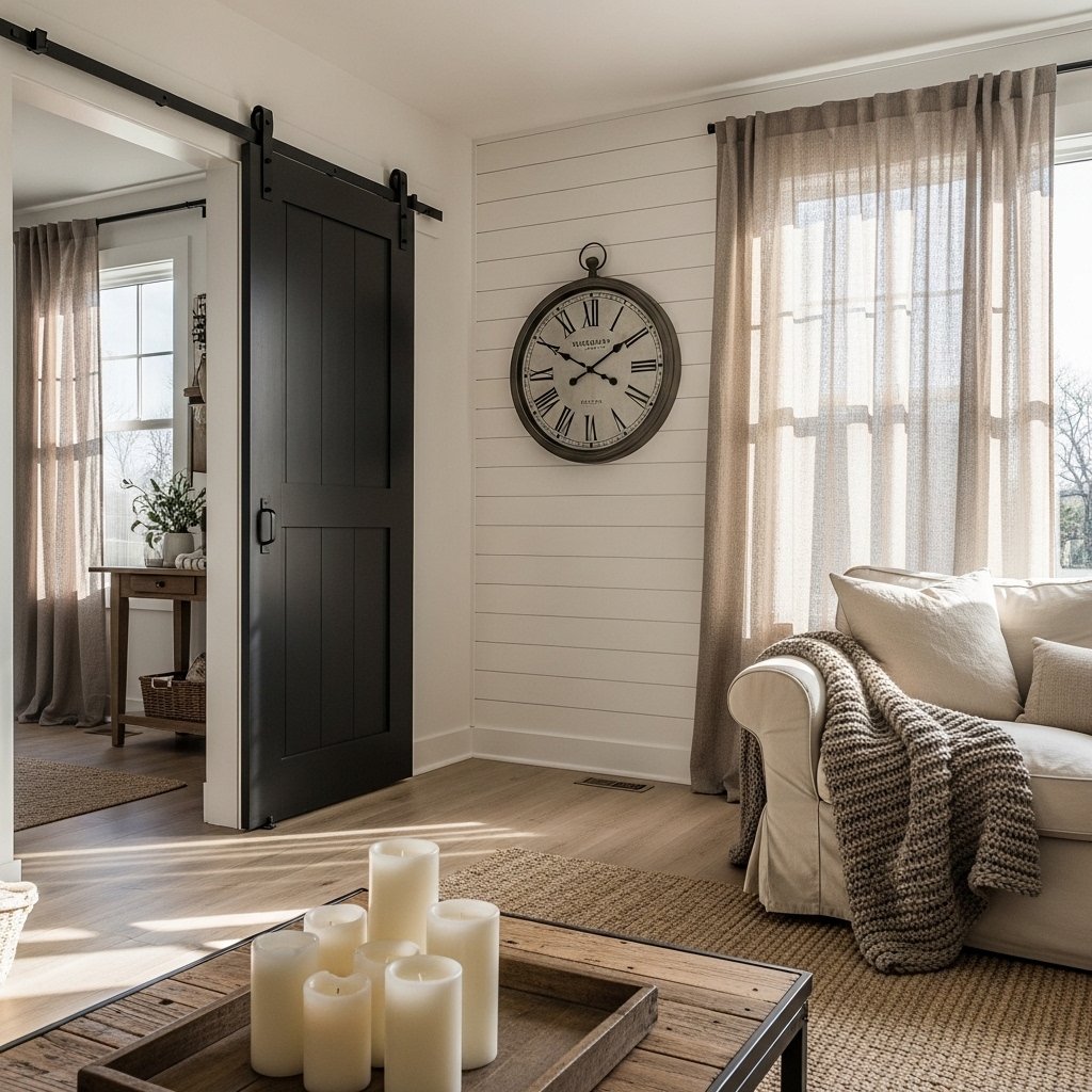 Nothing says modern farmhouse quite like shiplap. This horizontal wood paneling creates visual texture, warmth, and a sense of craftsmanship. Use it on a single accent wall behind the sofa, or run it floor to ceiling on a fireplace wall for maximum impact.