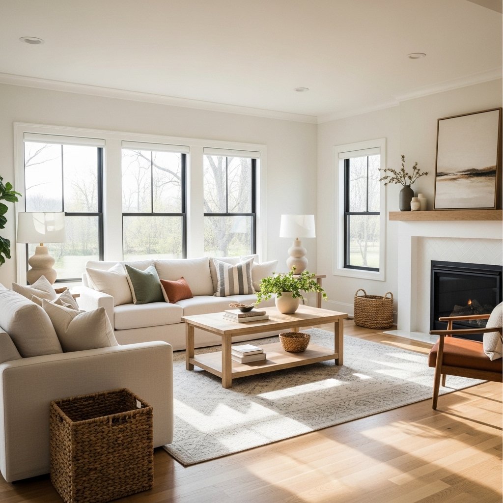 Popular choices include Benjamin Moore’s White Dove, Sherwin-Williams Accessible Beige, or any warm off-white that leans slightly golden. Avoid stark, cool whites — they can feel sterile against natural wood and woven textures.