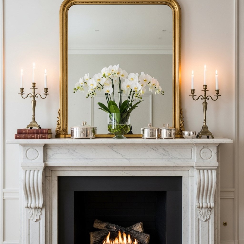 If you do not have a fireplace, create a focal point another way: a large statement mirror, an oversized artwork, a dramatic floor-to-ceiling bookcase, or even a beautifully styled console table. The key is that the eye has somewhere clear and intentional to land.
