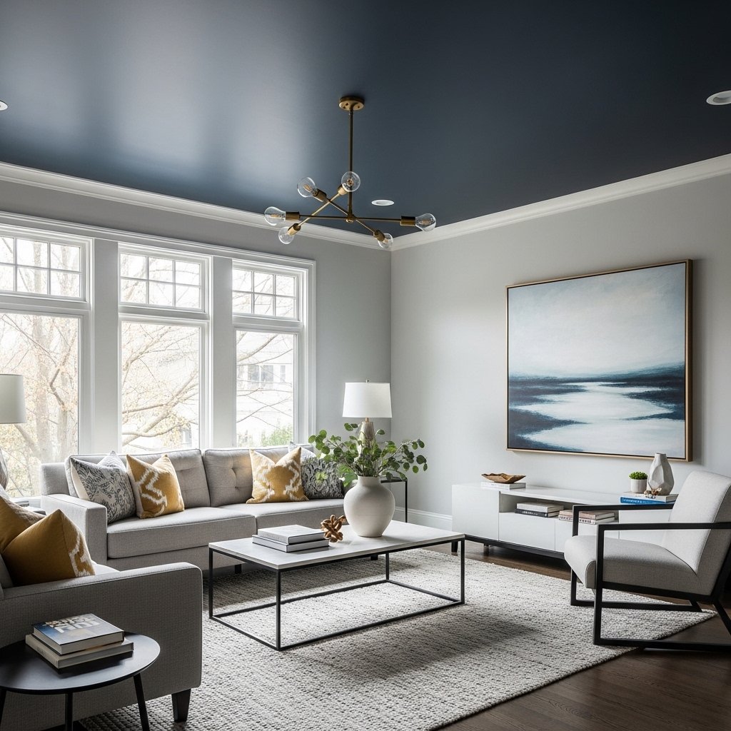 Try a deep navy, charcoal, or forest green on the ceiling while keeping walls in a soft complementary neutral. The contrast adds drama without overwhelming the space.