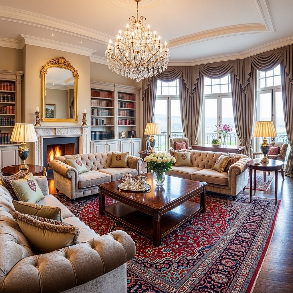 In luxury living rooms, the most popular rug choices include hand-knotted wool rugs, silk-blend Persian rugs, and natural fiber rugs like jute or sisal in neutral tones. Size is critical: the rug should be large enough that the front legs of all your main seating pieces sit on it comfortably.