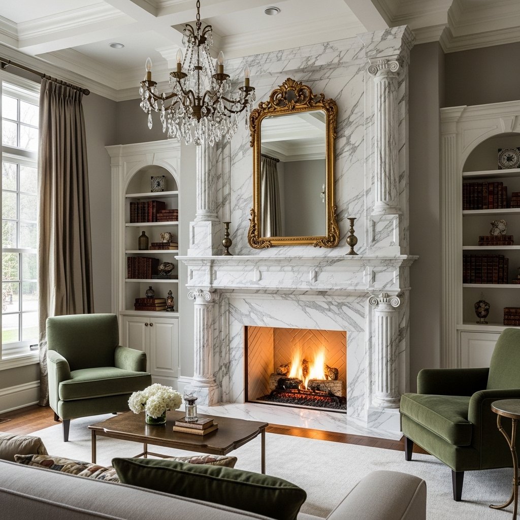 Nothing signals luxury quite like natural stone. Whether it is a marble fireplace surround, a travertine coffee table, an onyx decorative object, or even a marble tray on an ottoman, the presence of natural stone instantly elevates a room.