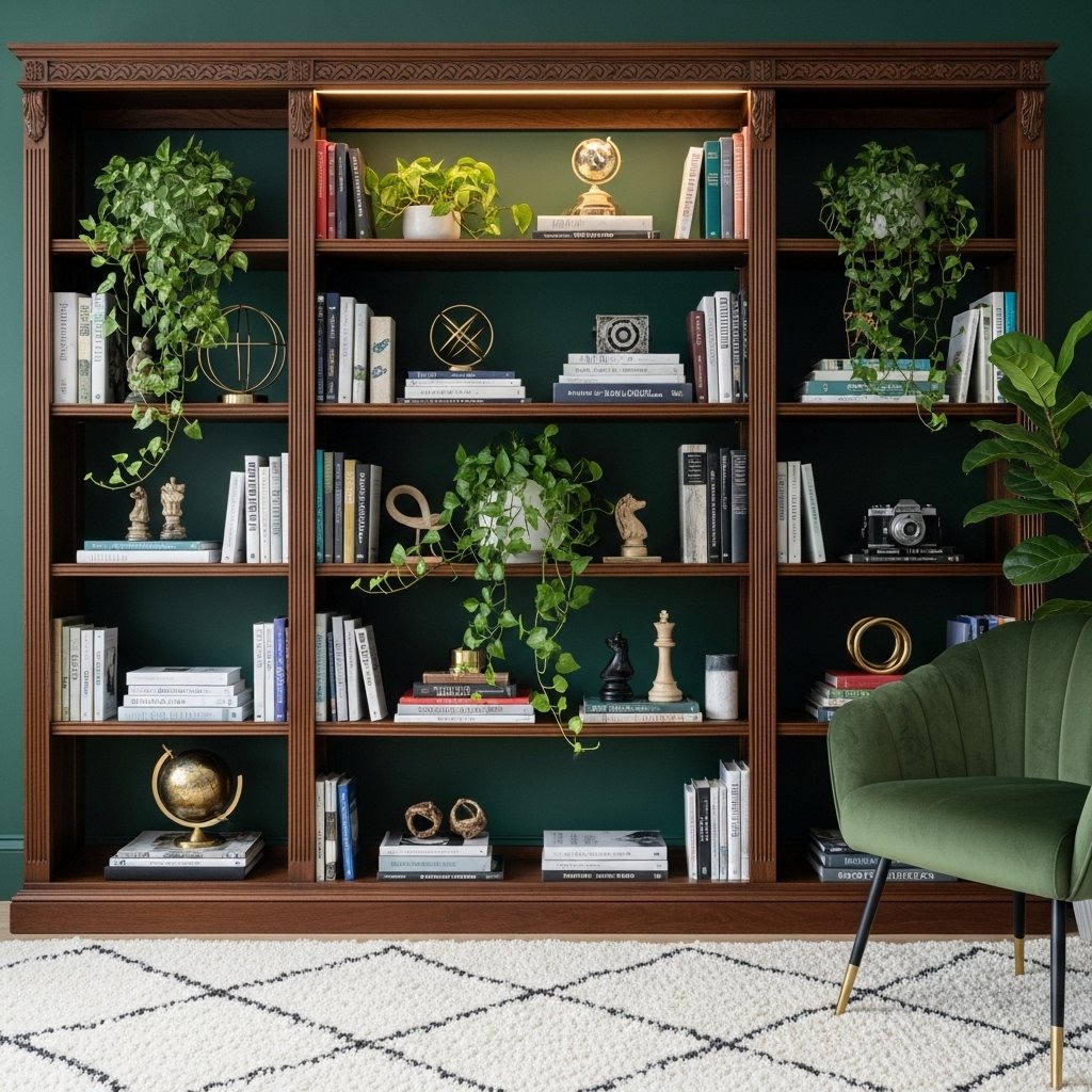 The professional approach is to mix books (arranged by color or by size) with decorative objects, small pieces of art, and organic elements like plants or sculptural stones. Remove the dust jackets from books for a cleaner, more cohesive look. Leave some shelves partially empty — negative space on a bookshelf looks intentional and refined.