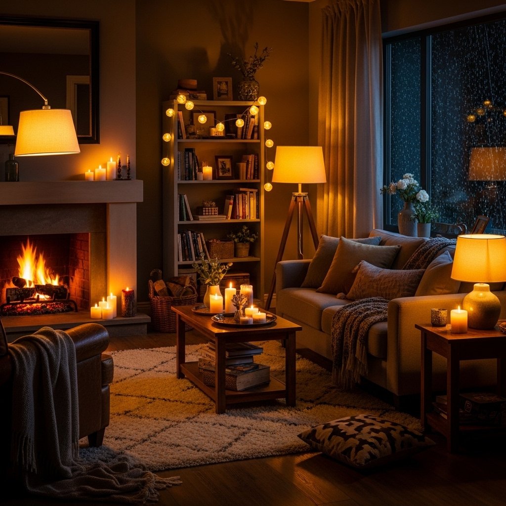 Professional interior designers always design with three layers of light: ambient (overhead), task (reading lamps, table lamps), and accent (picture lights, floor lamps, candles). This layered approach is what gives luxury rooms their warm, dimensional glow.