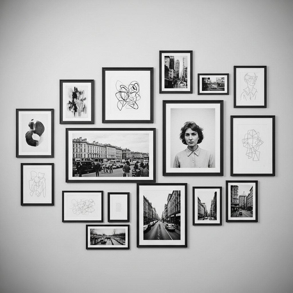 Frame all pieces in the same frame style and color to tie the collection together. Lay out your arrangement on the floor before hanging anything, and maintain consistent spacing of 2 to 3 inches between frames.