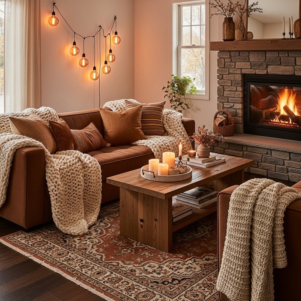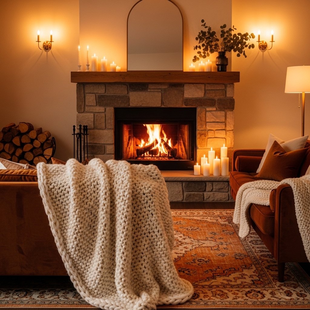 One throw blanket says ‘I have a throw blanket.’ Three throw blankets in different textures — a chunky knit, a soft faux fur, and a woven cotton — say ‘this is a cozy home.’ Drape them at different points on your sofa and armchair. Don’t fold them neatly. Let them fall casually. Lived-in, slightly rumpled throws are infinitely cozier than perfectly folded ones.