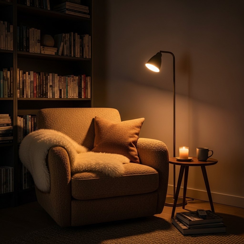 An arc floor lamp that curves over your sofa or reading chair provides the warm, directed overhead light that task reading requires — without the harshness of a ceiling spotlight. Choose a lamp with a fabric shade in cream, linen, or warm white. The warm glow it creates pools beautifully over your seating area and turns any corner into an irresistibly cozy invitation to sit down and stay.