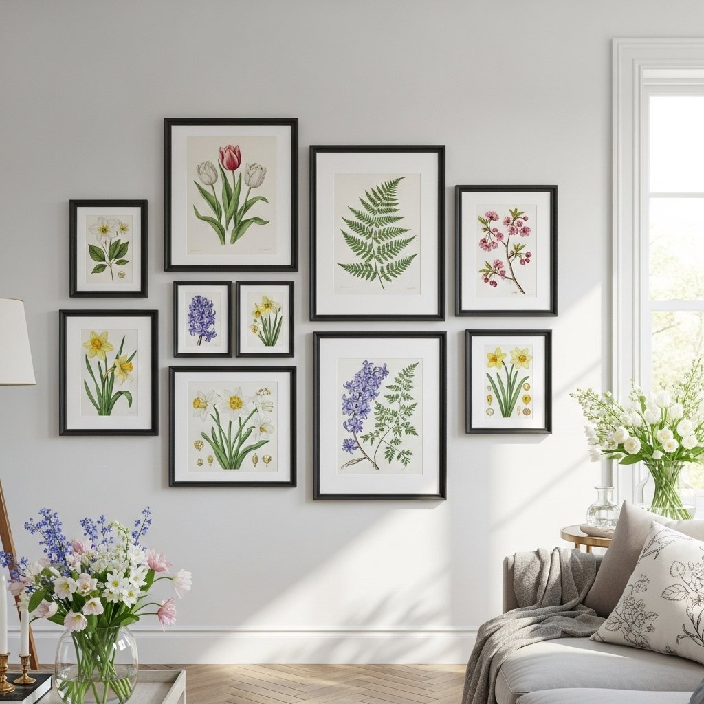 For spaces where live plants are impractical, a gallery wall of vintage botanical illustration prints provides the visual language of spring with zero maintenance. Frame three to five prints in matching simple frames — black or natural wood — and hang them in an asymmetric arrangement. The effect is collected, intentional, and endlessly saveable on Pinterest.