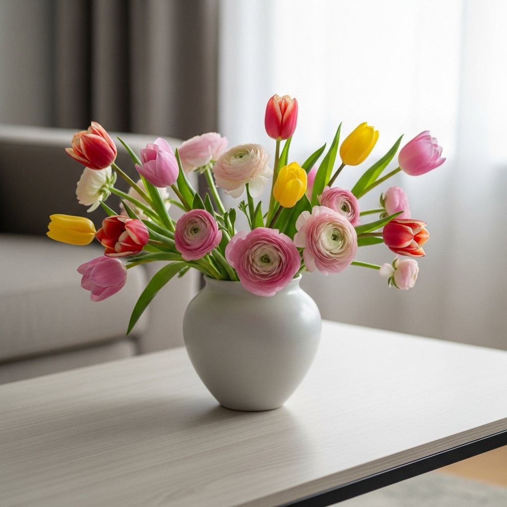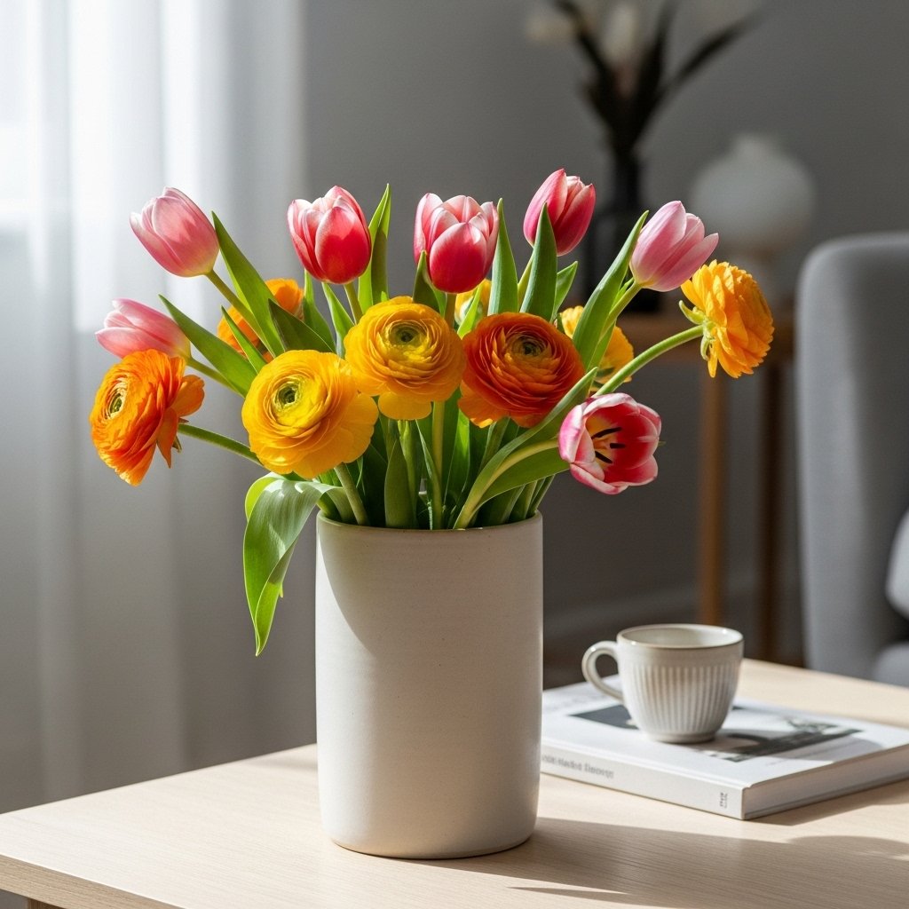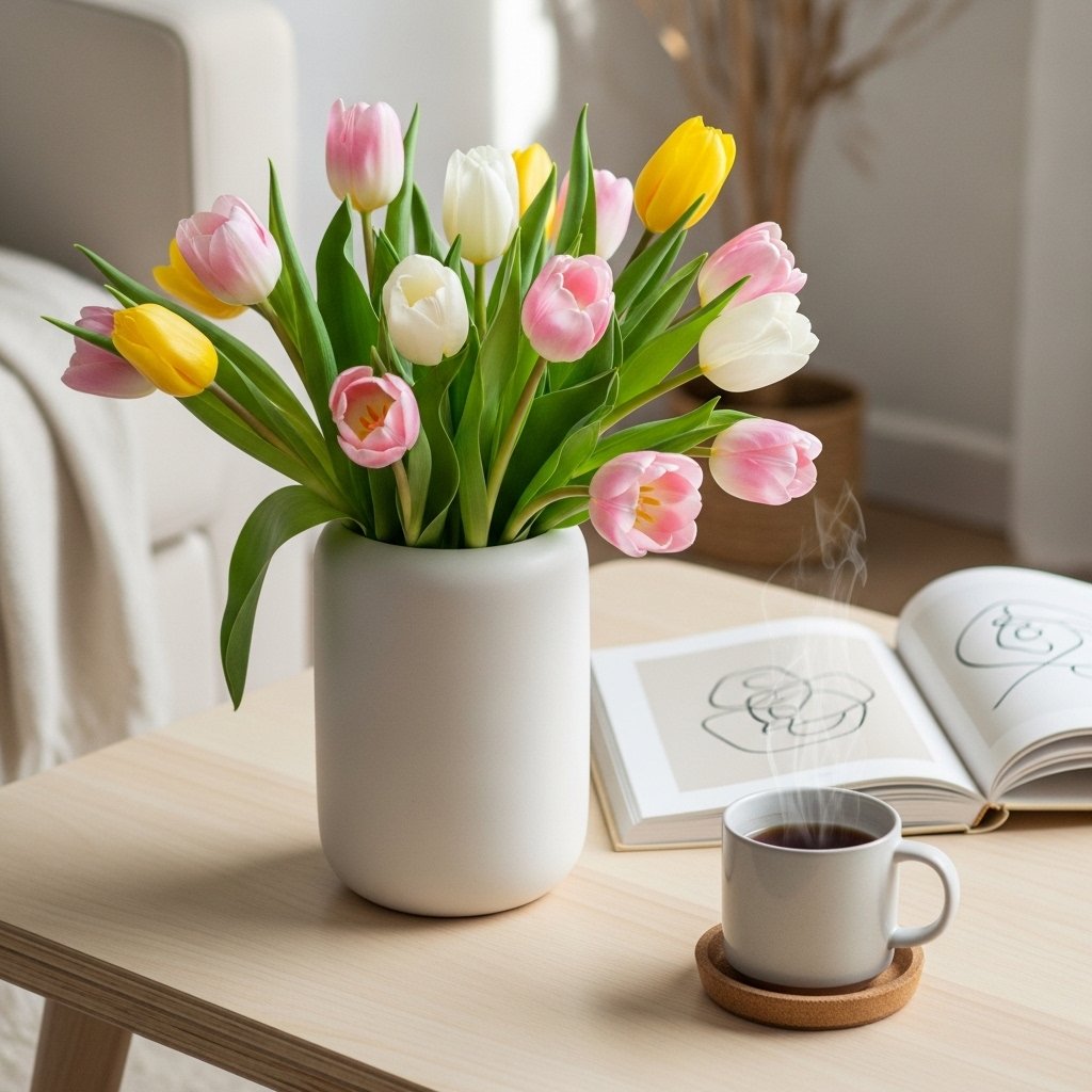 A single bunch of seasonal flowers — tulips, ranunculus, anemones, or daffodils — placed in a simple ceramic or glass vase on the coffee table is the fastest and most effective spring refresh available. The weekly renewal of fresh flowers creates a living, evolving quality to your interior that no permanent decor element can replicate.