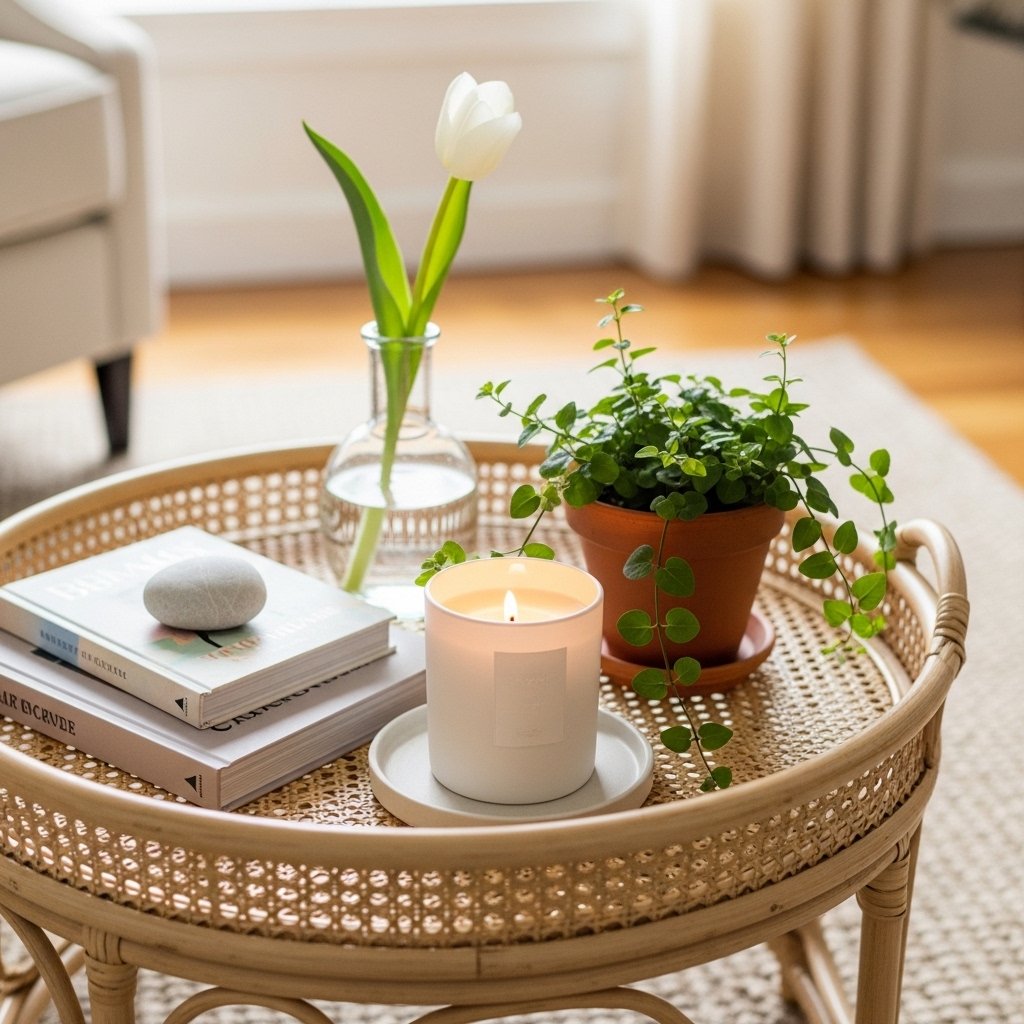 A coffee table vignette is one of the most pinned and saved compositions in home decor. The formula: one rattan or wooden tray as the anchor, one candle, one small plant or floral element, one decorative object (a crystal, a small ceramic, a stack of books). Edit aggressively. The rule is always fewer, better objects rather than more.