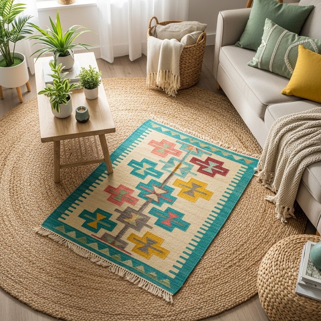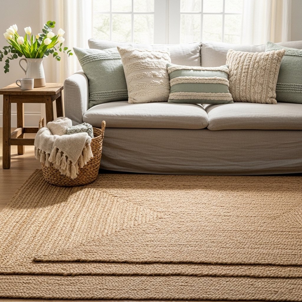 A jute, sisal, or seagrass rug grounds a spring living room in natural material language that reads as both intentionally designed and seasonally appropriate. Natural fiber rugs also photograph exceptionally well, capturing texture and warmth that synthetic alternatives cannot. Layer a smaller patterned rug on top for depth and editorial layering.Pro tip: Pair a 5×8 jute rug with a smaller 2×3 patterned kilim for a layered, high-design look.