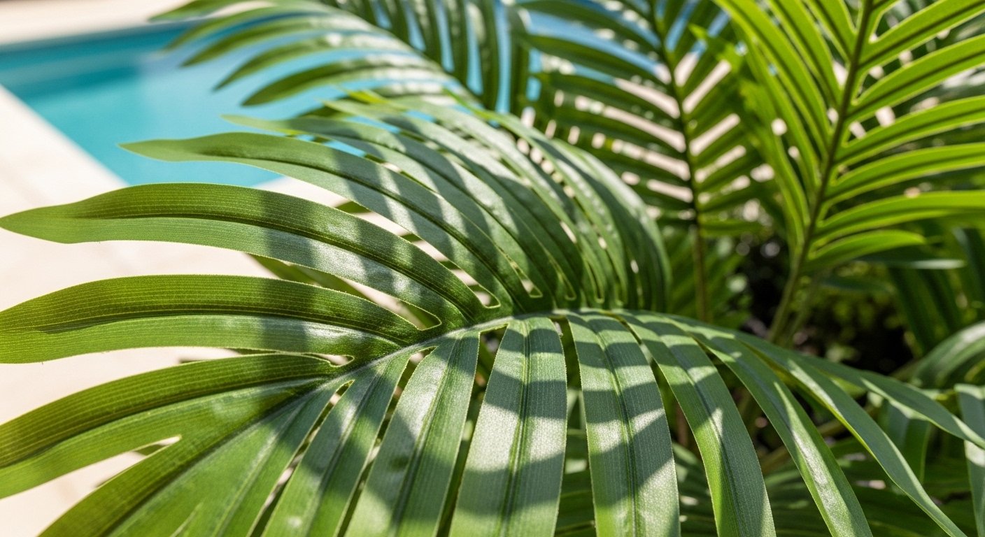 Outdoor artificial palm trees are the go-to choice here. They never drop leaves into the water and they handle moisture and chlorine air without any issues. Place a pair of tall fake palm trees outdoor at each corner of your pool for an instant resort feel.
