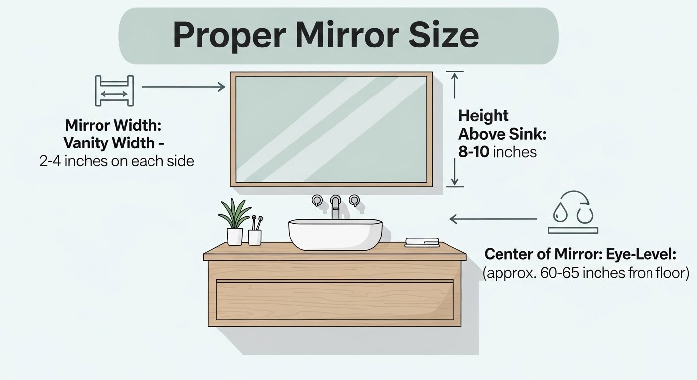 Your mirror should be between 2 and 6 inches narrower than your vanity on each side. So if your vanity is 36 inches wide, look for a mirror between 24 and 32 inches wide. This gives you that intentional, framed look rather than a mirror that seems too big or randomly sized.