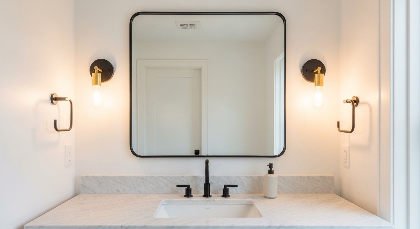 If you choose a gold bathroom mirror, echo that finish in your faucet, towel bar, and hardware. If you go with a black frame bathroom mirror, carry that matte black through all your fixtures. Consistency in metal finishes is the secret to a bathroom that looks professionally designed.